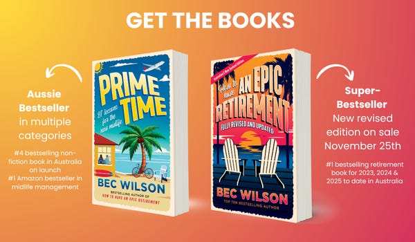 The new, updated edition of How to Have an Epic Retirement is out on 25 November, and it’s the perfect gift to set up your next chapter. And while you’re at it, grab a copy of Prime Time: 27 Lessons for the New Midlife (if you don’t have it already)—because midlife is where the magic (and the good bits) begins.